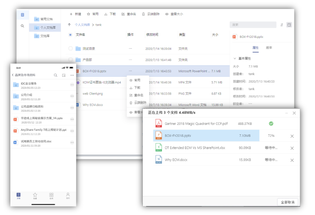 AnyShare Family 7 终端应用程序呈现为丰富客户端形态,基于跨平台技术和 Web 技术,为用户打造全终端一致性的使用体验和交互效果,并为企业提供一系列丰富的内容管理应用。