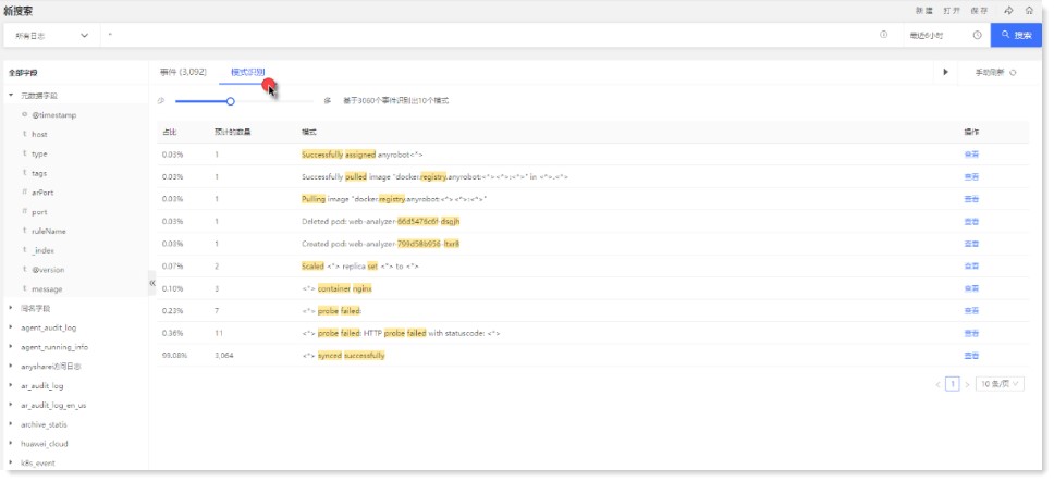 - 搜索查看日志模式识别结果,包括:各日志模式数量占比、预计的数量以及日志结构模式,其中关键词执行高亮显示。