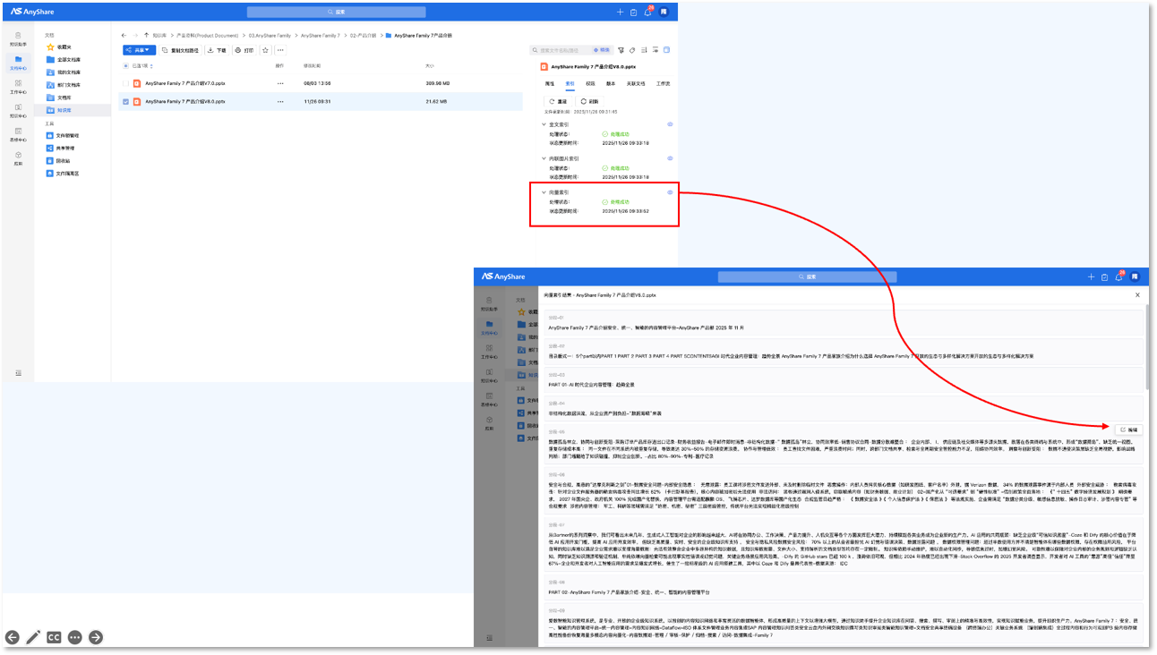 【知识助手】一、知识助手交互全面升级全新首页,统一智能入口,体验更流畅 AnyShare 7.0.6.6 版本对智能知识管理的首页进行了全面优化升级,整体布局与功能分布更加清晰、高效。新首页划分为以下核心区域,旨在为用户提供更直观、个性化的信息管理与知识协作体验: 欢迎区:位于首页顶部,展示欢迎标语与关键通知,帮助用户快速了解平台动态。 智能体个性化展示区:用户可将常用智能体添加至此区域,实现一键快速访问,提升日常操作效率。 企业/组织行为区:集中呈现与你相关的内容动态,包括“为你推荐”“最近访问”以及“组织动态”等信息,帮助你及时掌握团队动态与重要更新。 个性行为区:支持用户将常用的文档、WikiDoc、文件夹、在线知识库等资源添加至“快速访问”,打造专属工作空间。 知识助手交互区: 技能区:提供文档问答、文档总结、文件搜索、文档翻译、帮我写作等常用技能,用户可根据需求直接选用。 对话交互区:在此可与知识助手进行自然语言对话。助手能够理解问题并返回图文并茂的回答,同时提供推荐问题引导进一步追问。 ![]() 智能体应用支持按实际业务场景分类呈现,逻辑清晰易查找。用户可自主将高频使用的智能体添加至首页快捷入口,实现一键触达,整体使用体验显著提升。 ![]() 多模态文档问答,图文并茂更直观 多模态知识检索新体验,新增图片信息召回功能,可自动从 Word、PDF、PPT、WikiDoc及 FAQ 等文件中提取图片,并将其直接融入问答结果,实现真正的图文并茂。图文互补的回答形式,既保证信息完整性,又让复杂内容更易理解,显著提升了多模态知识检索的交互体验。 ![]() 回答内容高亮优化,信息获取更高效 通过优化回答内容的高亮策略,对核心关键词与重点信息进行突出展示,同时将参考文献链接默认折叠,使回答结构更清晰、主旨更明确。使用户可以快速把握核心观点,减少信息干扰,提升内容可读性与信息获取效率。 ![]() 二、知识助手运营新体验 智能体运营分析更直观 管理控制台新增智能体运营统计模块,支持使用人数、会话次数、对话长度及问答点踩率等多维度的数据追踪与分析。为管理员呈现运营的全景视图,助力精准识别高频需求与回答质量,为优化智能体提供量化依据,从而驱动用户体验与应用效能的全面提升。 ![]() 回答反馈截图体验优化 知识助手反馈机制迎来优化:用户点踩时,系统将默认勾选并上传当前对话截图,自动捕获问题发生的上下文。确保每次反馈都附带真实语境,为精准分析回答缺陷提供依据,持续优化回复质量。 ![]() 【文档中心】一、索引重建与编辑新增索引手动重建与管理功能,面向文档所有者及知识库管理员等关键角色。当文档索引构建异常或失败时,可手动触发重建,确保知识检索服务的持续稳定。 ![]() 新增支持编辑修订向量索引内容,确保所有最新内容都能被即时、准确地检索到,从根本上保障知识服务的持续稳定与高可用性。 ![]() 二、在线打印及打印权限控制 支持具备打印权限的用户,直接在预览界面选择打印功能,对文件进行在线打印,以便于线下使用,支持打印的文档格式包括word、excel、pdf、ppt等。 ![]() 三、超大文件上传支持 Web端现已支持上传超过5GB的单个超大文件,满足您传输大型文件(视频、设计稿、软件包等)需求。 ![]() 四、外发固定版本文件 在生成外链时,用户可选择分享文件或文件夹的当前版本,确保外部接收方始终访问指定版本内容。这样既可以避免因后续内容更新而造成的信息泄露问题,又可以解决因内部内容迭代导致的外部信息不一致问题,增强内容协作的可控性。 ![]() 五、批量共享,协作效率再升级 支持同时选中多个文件或文件夹,统一设置访问权限、有效期,一键共享给指定同事或部门。 ![]() 六、多编目模板,让知识井井有条 支持用户为文件或文件夹灵活选择并应用不同的编目模板。每个模板设置完整的属性字段,实现不同业务场景下的分类与属性标准化管理。 ![]() 七、新增下载链接防盗功能,降低文件泄露风险 当前,从Web端AnyShare下载文档时,系统会自动生成下载链接(15分钟内有效),此链接可能被复制到其他浏览器或设备进行下载,存在文档外泄风险。因此,本次新增OSS网关防盗链功能,开启后可防止下载链接被重复复制使用,从而有效降低文件泄露风险,进一步提升系统安全性。 【知识发布优化】一、知识发布统一入口在首页新增文档快捷发布入口,支持用户将文档中心、个人知识库或本地文件中的文档,一键发布至企业在线知识库。打通知识从创建到共享的路径,显著简化发布流程,赋能企业知识资产的高效积累与增长。 ![]() 【开放集成,对接第三方AI应用开发平台】支持将 AnyShare 作为外部知识库无缝接入。在 Dify 创建智能体时,现可直接选用 AnyShare 中的文档库、Wikidoc 或 FAQ 等数据源进行知识检索与内容召回,结合先进的文本切片与向量处理技术,显著提升智能体回答的准确性与可靠性。同时,通过 Dify 与 AnyShare 用户身份体系的统一对接,确保在问答过程中权限控制与 AnyShare 原有设定完全一致,从机制上保障数据访问的安全性与合规要求。 注:除了Dify,AnyShare已同步支持Coze、HiAgent等主流AI应用开发平台,通过接口或MCP提供文档元数据获取,文档解析内容获取,文档召回和图谱召回,Agent调用,Bot 对话等能力,并确保权限统一、安全访问