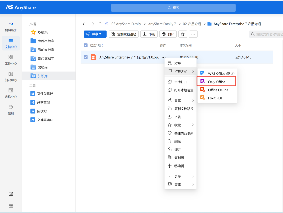 ![]() 【Linux同步盘】为了更好的支持信创国产化场景,提升产品竞争力,AnyShare本次发布的Linux同步盘支持如下操作系统:![]() Linux同步盘具体功能如下: 1、支持缓存延迟加载功能,按需动态加载文件/文件夹。 2、支持悬浮窗口快捷入口访问,方便用户快速打开云盘、文档库、访问本地同步等功能。 3、支持文件拖拽上传下载,快捷键文档拷贝,提升使用效率。 4、支持本地同步功能,满足用户自主设置同步目录进行备份和加载文件。 5、支持策略下载功能,支持设置缓存目录为自动下载,自动更新目录,自动更新已缓存文件的功能。 6、支持右键菜单便捷功能,包括缓存、刷新、云端删除、共享、收藏、清除缓存等。 7、支持角标提示功能,根据文档加载状态显示不同的角标,方便用户实时掌握文档的同步结果。 ![]() ![]() 【文档中心】一、文档库级历史版本管控,优化存储资源新增文档库级文件历史版本管控策略,用户可自主设置单个文件最多保留的历史版本数量,避免存储空间被冗余历史版本占用,既保障核心版本可追溯,又高效优化存储资源。 ![]() 二、新增Only Office 在线编辑预览 在原有 Office Online / WPS Online的基础上,新增 Only Office在线编辑和预览功能,为用户提供更多在线工具选择,适配不同用户的使用习惯。