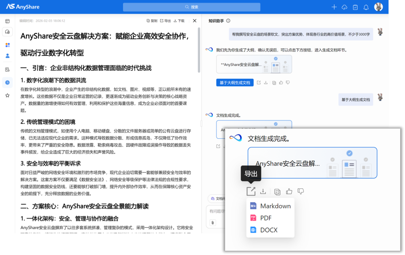 ![]() ![]() 二、智能内容提取服务(Content-extractor)能力升级:通过部署GPU资源,用于对包含图文混排、复杂版式的pdf进行内容提取;对公式、表格、图片等多模态内容提取准确率提高,且保留文档层级结构。 【知识助手】一、专家撰写:支持结合知识库内容进行全文创作知识助手新增【全文写作】、【全文扩写】、【全文续写】三大技能。