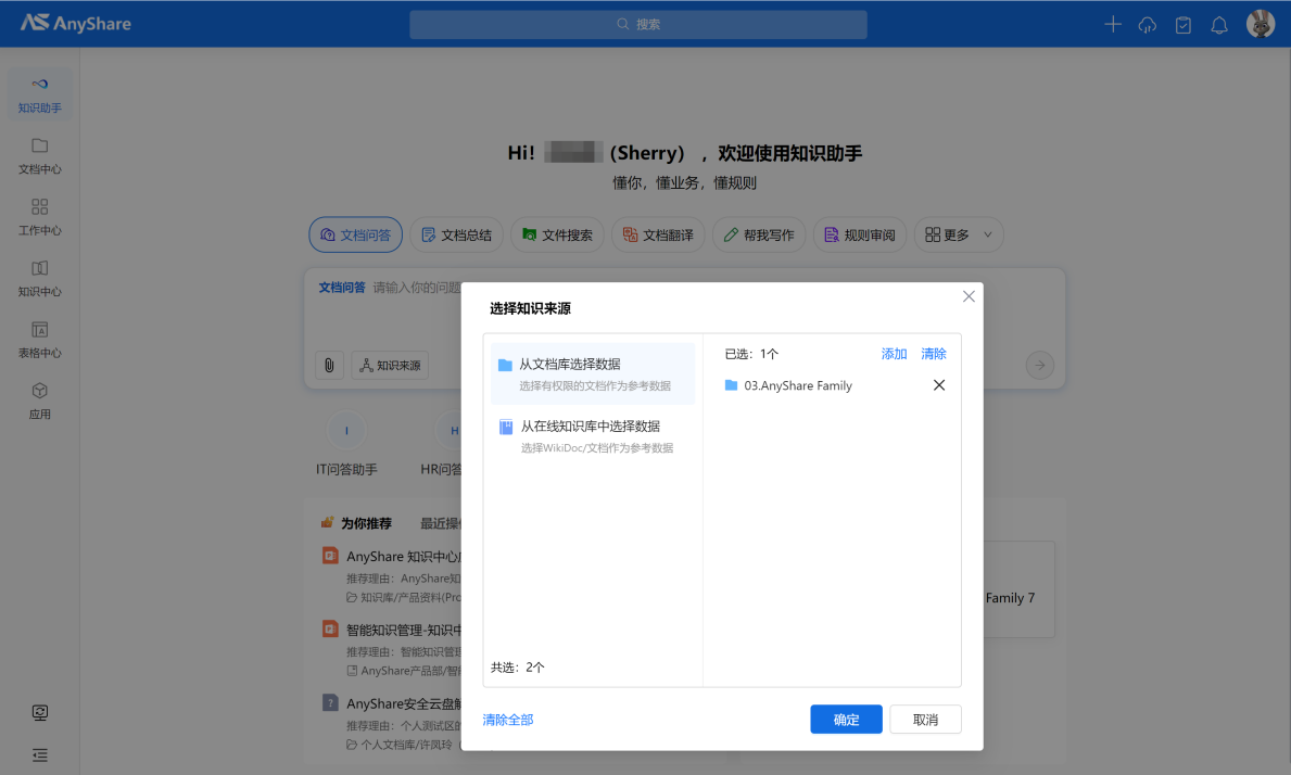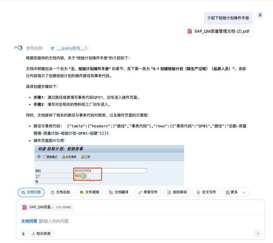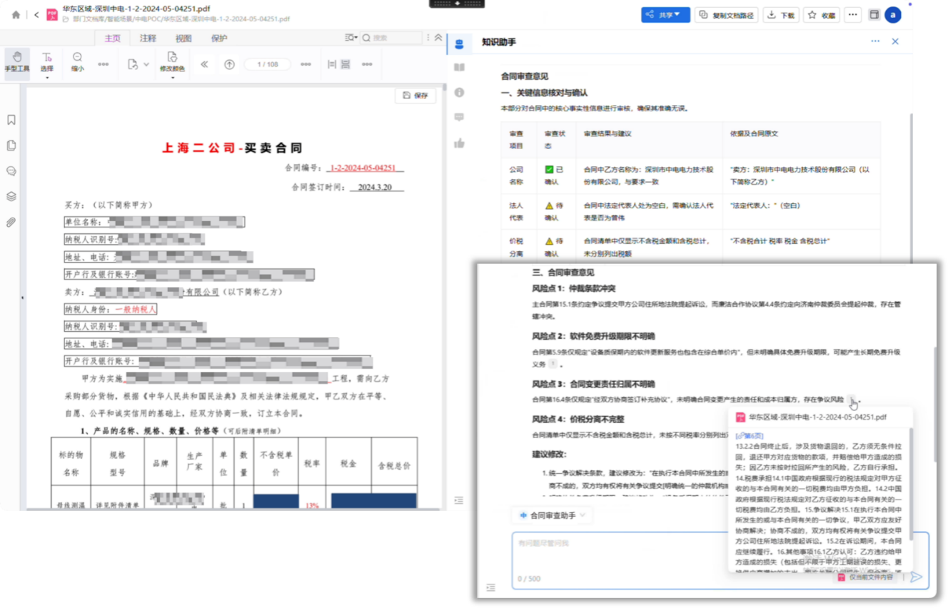 知识助手新增【规则式审阅】技能,涵盖基础审查(自动识别错别字、标点错误、金额大小写不一致等格式问题)与要素审查(精准提取合同等文档核心要素并结构化呈现),支持适配客户自定义审阅规则模板。 审查完成后自动生成含问题标注、要素详情及合规建议的报告,支持在预览页面定位到原文页码,大幅提升审查效率,减少业务延迟与人工误判。 ![]() 三、你问我答:支持选择知识来源,支持使用文档问答技能时对临时区文件的图文并茂回答。