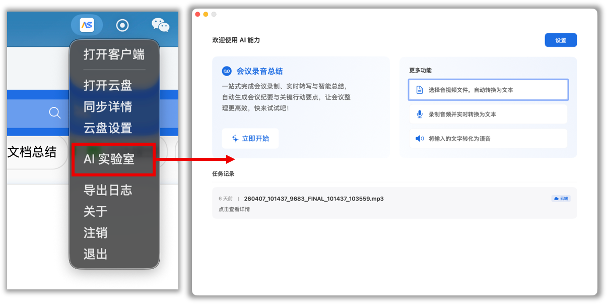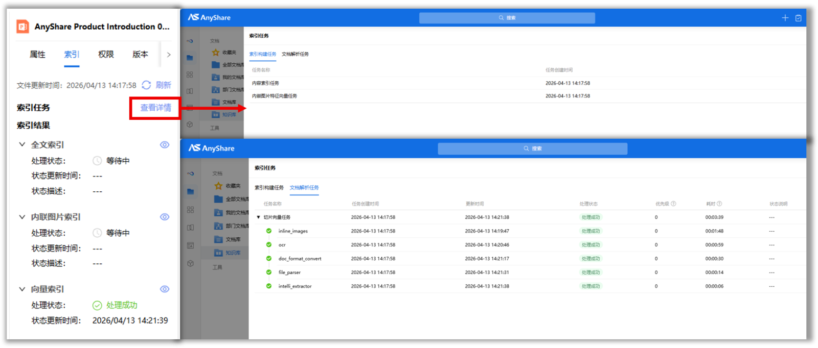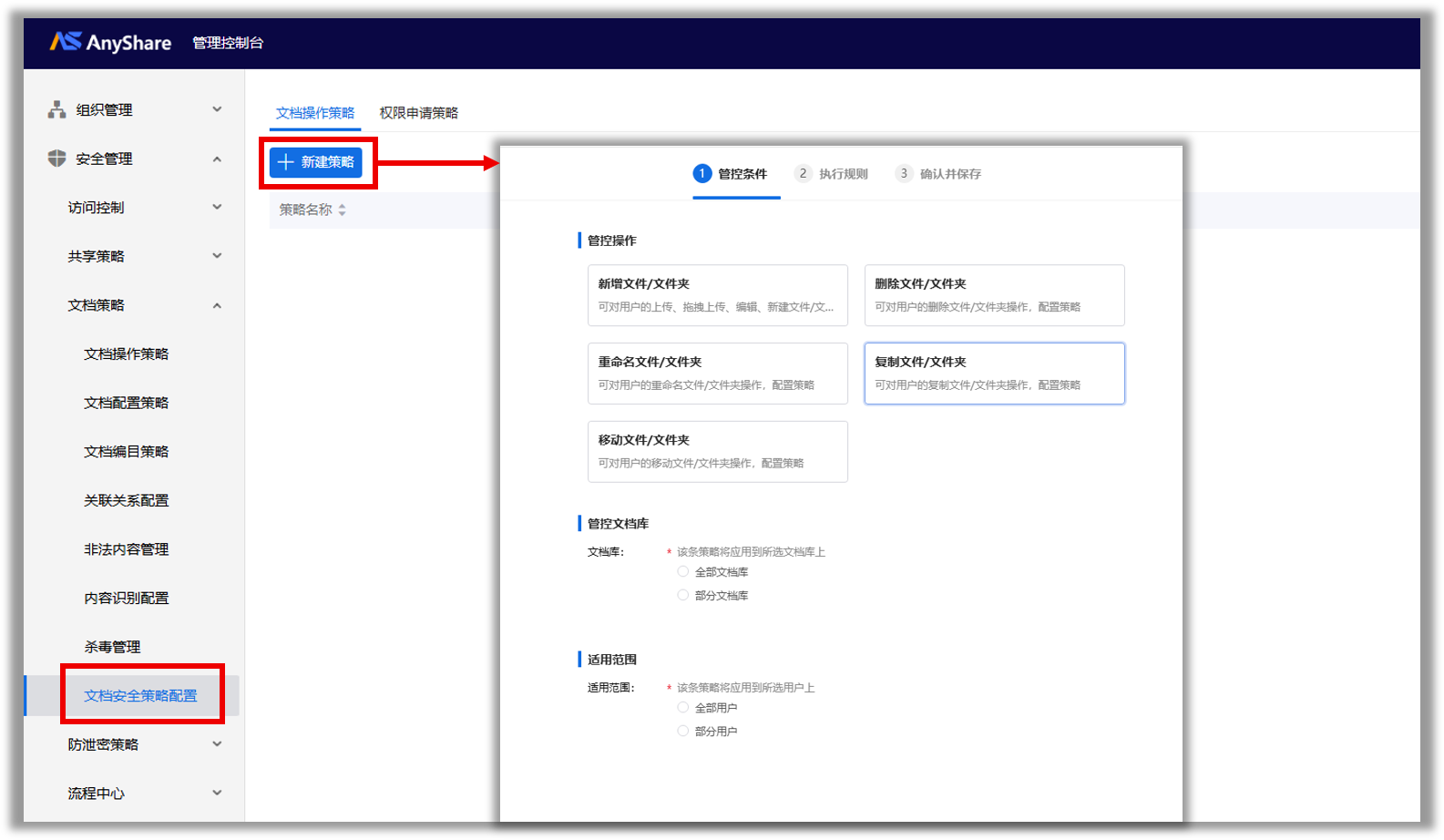 支持智能体会话记录及点赞 / 点踩反馈数据实时上报至消息队列,便于外部应用监听订阅,实现自定义统计分析与运营决策,提升用户行为数据利用效率。【同步盘】一、Mac 同步盘新增会议录音总结功能:Mac同步盘新增会议录音总结能力,操作路径清晰:从Mac顶部菜单“AnyShare图标 - AI实验室 - 会议录音总结”进入,选择开始录音后,可弹窗录制环境音与系统声音;生成的录音文件自动存储至知识助手临时区(个人文档库临时区文件夹),会议纪要处理完成后,可通过任务记录打开知识助手对话查看结果,实现会议内容高效留存与总结,节省人工整理成本。 ![]() 二、 Mac同步盘新增文件夹常驻功能 Mac同步盘支持设置文件夹“始终保留在此设备上”,启用后可保持本地文件夹与AnyShare云端内容实时同步,无需手动触发同步,确保本地与云端文件一致,提升文件访问与协作效率。 ![]() 三、Windows同步盘强化防泄密能力 Windows同步盘新增防截屏、防打印策略,有效限制敏感文件的截屏与打印操作,降低文件泄露风险,强化数据安全管控。 ![]() 【文档中心】一、索引任务状态可视化文档侧边栏新增索引任务状态显示功能,可直观观测文件索引创建的实时进度,便于用户了解文档检索准备情况,提升检索效率与使用体验。 ![]() 二、文件/文件夹管控策略升级 新增文件/文件夹全场景管控策略,在原有新建、上传行为管控的基础上,新增复制、移动行为管控,实现对文件/文件夹全生命周期关键操作的管控,强化数据安全与合规管理。 ![]() 三、文档历史版本对比优化 支持PDF与Word文档历史版本对比,可清晰查看不同版本间的内容差异,便于追溯修改记录、恢复历史版本,提升文档协作与管理的准确性。 ![]() 四、支持两个文档之间的对比 支持PDF/Word格式的两个文档之间的对比,可清晰查看内容差异,便于追溯修改记录、提升文档校对效率。 ![]()