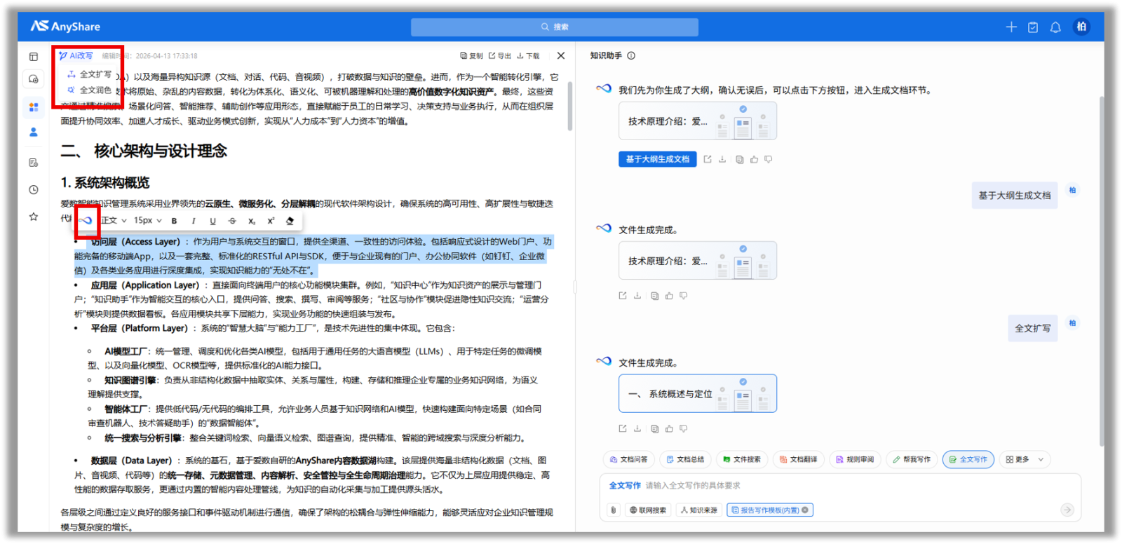 知识助手能力升级,多模块体验与安全性全面优化! 【知识助手】一、智能体新建支持 ChatFlow 模式智能体新建新增ChatFlow可视化流程编排模式,支持通过工作流节点连接的方式定义对话逻辑,无需编程即可构建可控性强的复杂对话式智能体,降低智能体搭建门槛,适配复杂场景交互需求。 ![]() 二、核心技能效果全面优化: 优化知识助手核心技能表现,提升多场景适配能力,强化使用体验: 1、文档问答体验升级:支持渲染回答中包含的LaTeX数学公式,精准还原专业学术内容;同时支持Mermaid图表显示,让流程图、架构图等内容直观呈现,解决专业文档问答中公式、图表无法正常展示的痛点。 ![]() ![]() 2、长文本处理能力提升:文档翻译、文档总结、全文写作、全文续写四大核心技能新增长文本支持,可高效处理大篇幅文档,无需拆分内容,提升内容处理效率与完整性。 3、临时区功能拓展:临时区支持上传图片,可基于上传图片进行智能问答,实现图文结合的交互模式。 ![]() 4、技能模板可灵活管理:技能模板新增新建、修改、删除等操作接口,支持用户根据业务场景自定义技能模板,提升技能复用性与配置灵活性。 5、预置人设回复逻辑模板,支持一键选用:新增预置人设回复逻辑,提供文档问答、智能写作两类预设模板,配置时可一键选择使用,让回复更贴合业务场景。 ![]() 三、操作体验优化: 1、AI工具栏优化:优化全文写作的AI工具栏布局及交互逻辑,操作更便捷,提升智能写作与编辑效率。 ![]() 2、联网搜索配置优化:优化知识助手联网搜索配置流程,简化配置复杂度,提升配置效率。 四、MCP 标准化开放能力全面升级 新增 MCP 标准化支持,通过获取用户长期 Token 实现身份长效鉴权,统一集成知识助手、登录、上传下载、文档解析、内容召回等核心业务能力; ![]() 同时基于 MCP 协议开放智能体全流程管理接口,支持配置、分类、权限移交、代为发布等精细化管控能力,可通过龙虾或个人代理灵活调用。整体打破系统交互壁垒,大幅提升平台拓展性、兼容性与接入效率,满足企业多场景、规模化的智能体应用与生态接入需求。 |