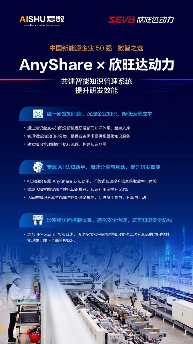 把握时代机遇,以创新技术点亮智能制造。基于 AnyShare Family 7 让知识管理系统成为技术创新、管理创新的重要载体,爱数与欣旺达动力携手共进,为员工构建开放、互动、共享的平台,促进知识创新与增值,以内容改变生产力。