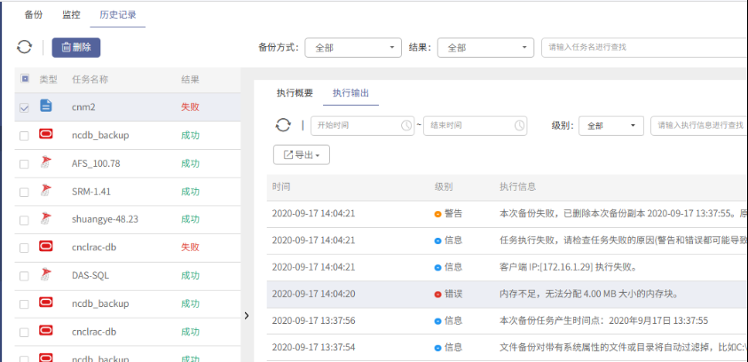 AnyBackup-执行文件备份失败,提示错误信息:内存不足,无法分配 4.00 MB 大小的内存块。