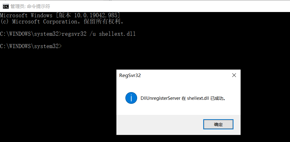 未以管理员身份运行 Windows 命令提示符,执行文件状态图标反注册命令失败。