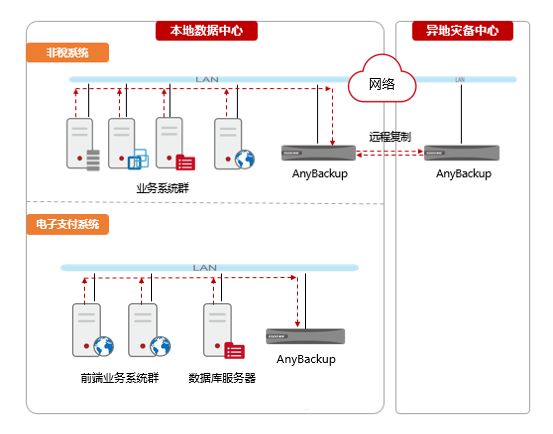 重庆市财政局对数据安全要求较高,并考虑到自身的网络情况,因此,选择在本地数据中心部署两套爱数AnyBackup,一套用于备份非税系统的数据,另一套用于备份电子支付系统的数据,彼此隔离,互不干扰。在此基础上,在异地灾备中心,重庆市财政局还部署了一套AnyBackup,用于同步本地数据中心非税系统的备份数据,提升非税系统数据的安全等级。