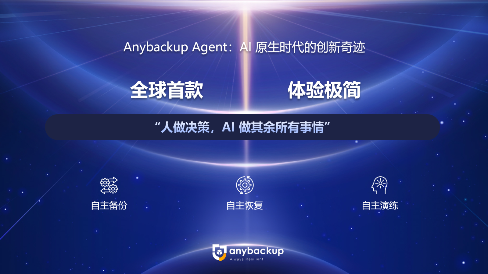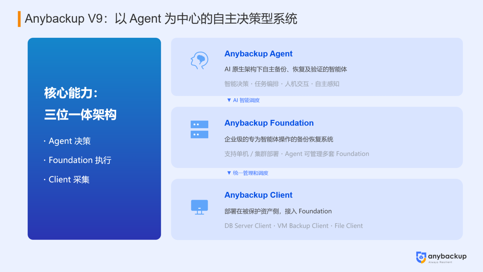 Anybackup Agent 作为 Anybackup V9 最核心的创新点,是全球首款以体验极简为设计目标的 AI 原生的自主备份、恢复及验证的智能体,基于三位一体的架构以及可扩展的知识网络和自主决策智能体两大核心技术,助力企业构建渐进式的备份策略、自识别恢复策略、故障自适应和全面兼容性等能力,以实现人做决策,AI 做其余所有事。