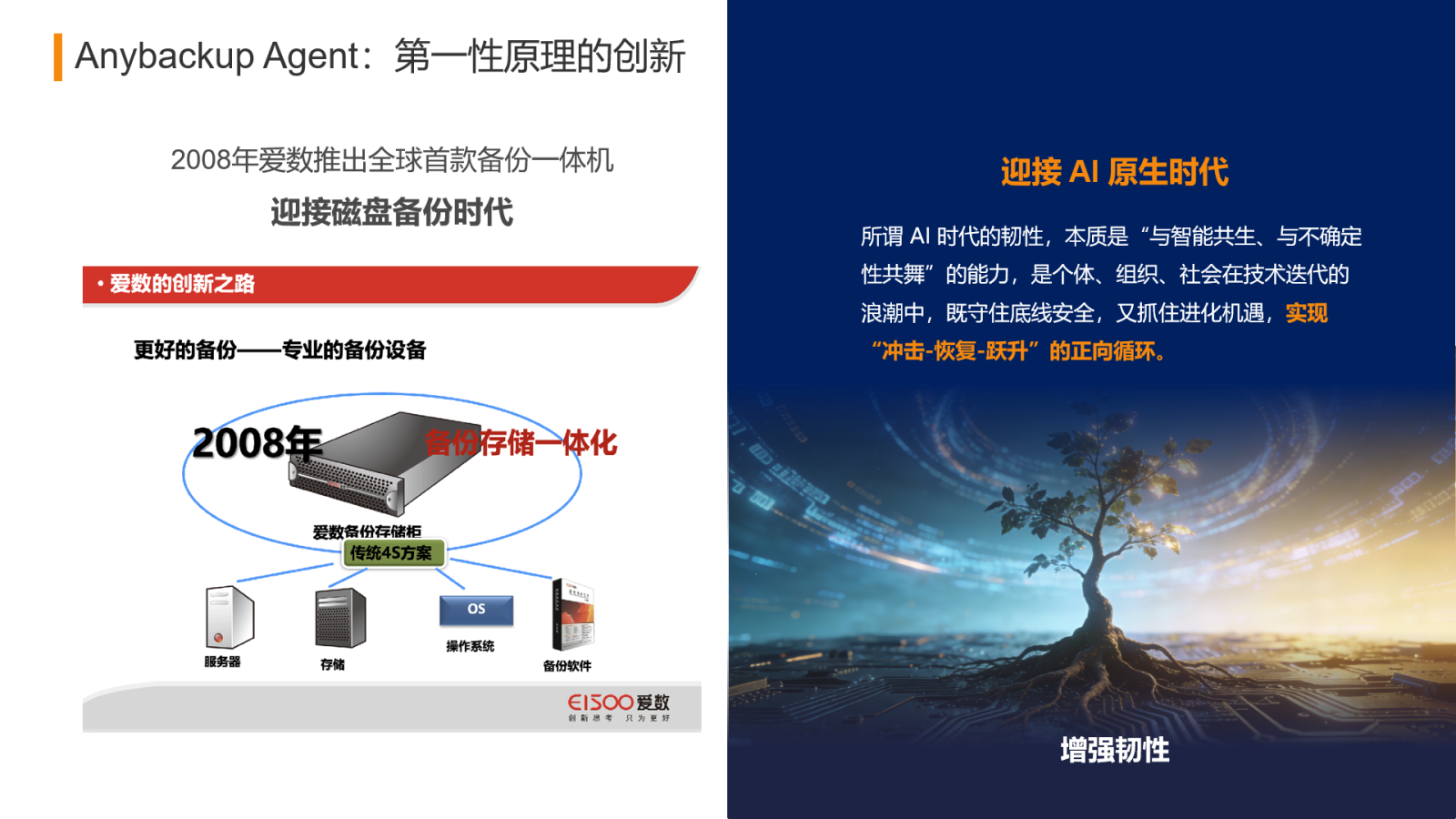 爱数此次推出 Anybackup Agent,并非偶然的技术探索,而是延续了其立足需求驱动、基于第一性原理的创新基因,这一创新理念与 2008 年爱数推出全球首款备份一体机一脉相承。2008 年,面对磁带备份向磁盘备份转型过程中操作复杂、架构繁琐的痛点,爱数首创备份一体机,实现备份存储一体化,简化备份架构与操作流程,迎接磁盘备份时代的到来。
