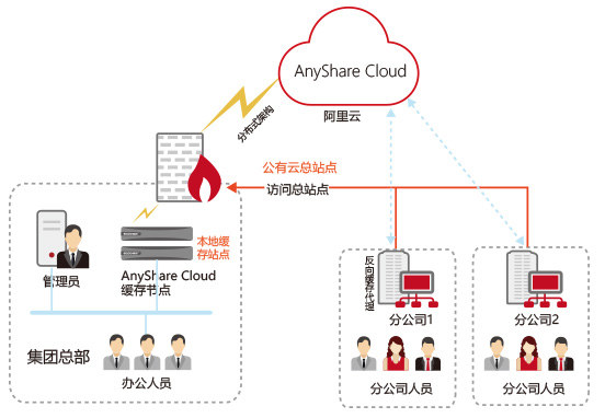 • AnyShare Cloud OnManaged/OnPublic + 缓存站点组合的分布式部署架构;