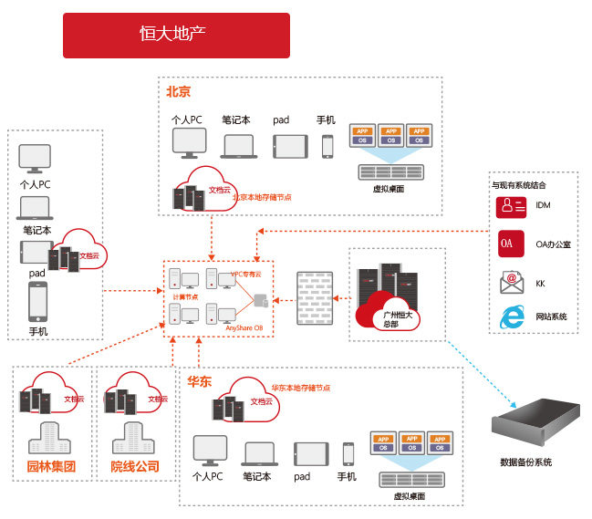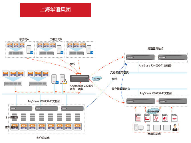 一些大型集团、跨国企业组织机构众多,人员往来频繁,在跨区域共建共享需求迫切的需求背景下,爱数提出AnyShare分布式部署及容灾解决方案,在总部与分支机构分别部署AnyShare站点,这些站点之间组成一个大的虚拟AnyShare多站点集群,保证所有用户在同一视图平面,各分支机构用户在授权范围内能够查看、编辑、删除任意站点的文档数据,而不需要切换站点,在“多地域同时登录,网络带宽有限”的前提下,提高文档数据访问效率。