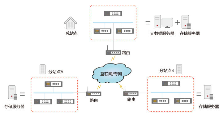 每个站点其实分别是一套集群系统,通过企业路由连入公网或专网,所有站点都由总站点统一控制和调度 元数据集中存放在总站点,文件数据分散存放在各个站点(具体位置根据归属关系而定), 总站点提供元数据管理服务(同时也提供存储服务),分站点只提供存储服务(元数据服务为禁用状态)
